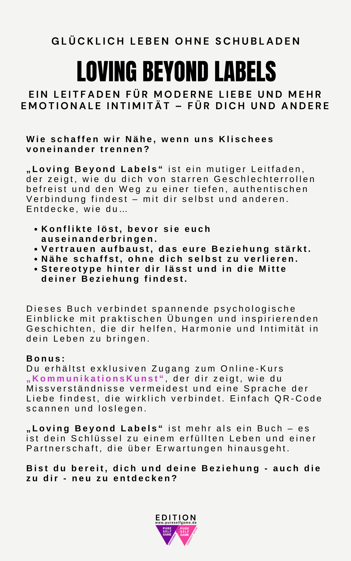 - Buch: „Love Beyond Labels – PureSelfGame™ EDITION“ Mein aktueller Ratgeber für moderne Liebe und mehr emotionale Intimität, basierend auf den Prinzipien des ColorFlowCycle™. Ein Leitfaden, um Beziehungen authentischer und erfüllender zu gestalten. Enthält Zugang zum kostenlosen Online-Kurs „KommunikationsKunst“. (Verfügbar aktuell nur innerhalb der bezahlten Version der PureSelfGame™ Community EDITION )